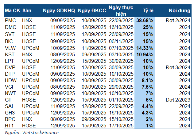 In addition, two companies will close the dividend entitlement with a ratio of 15% (VND 1,500/share) next week, namely BIC and SVT. The ex-dividend dates are Sep 09 and Sep 11, respectively, and the payment dates are Nov 06 and Sep 26, 2025.