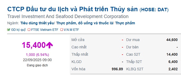 Specifically, DAT continued its ceiling-hitting streak from September 15th to 19th, boosting the stock price from 10,400 to 14,400 VND per share, marking a nearly 38.5% increase. The session on September 19th also marked the 10th consecutive ceiling-hitting session for this stock. Compared to the period before the rally, the stock price surged by almost 95%.