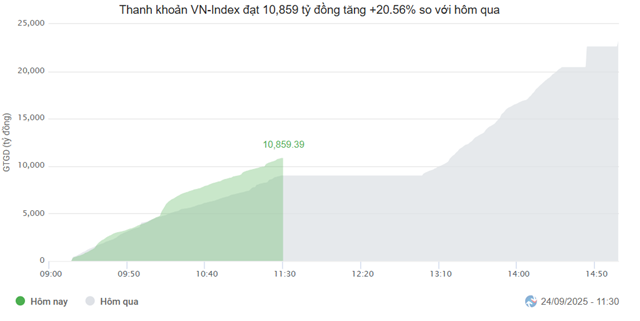 Market liquidity increased compared to the previous session, with the order-matching trading volume of the VN-Index reaching over 942 million shares, equivalent to a value of more than 25 trillion VND; the HNX-Index reached over 91 million shares, equivalent to a value of more than 2.1 trillion VND.