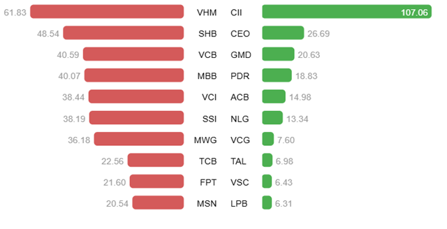 In terms of influence, the Vin Group duo, VHM and VIC, had the most negative impact, subtracting 2.88 points and 1.96 points from the VN-Index, respectively. Meanwhile, the top 10 positively influential stocks collectively contributed just over 1 point to the overall index.
