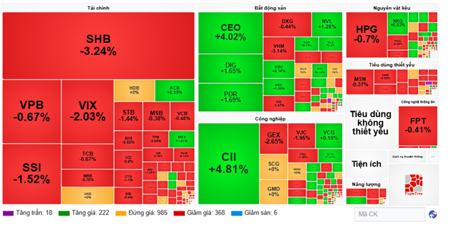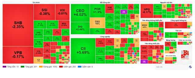Compared to the opening, buyers and sellers were evenly matched, with a strong divergence as over 1,000 stocks remained unchanged. There were 261 advancing stocks (15 at the ceiling) and 265 declining stocks (8 at the floor).