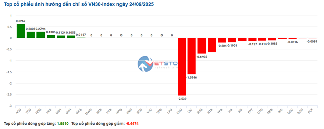The breadth of the VN30-Index basket was mixed, with red dominating. On the negative side, VHM subtracted 2.53 points, VIC 1.59 points, SHB 0.69 points, and STB 0.62 points from the overall index. Conversely, a few stocks like ACB, TCB, HDB, and VRE contributed over 1.3 points to the index.