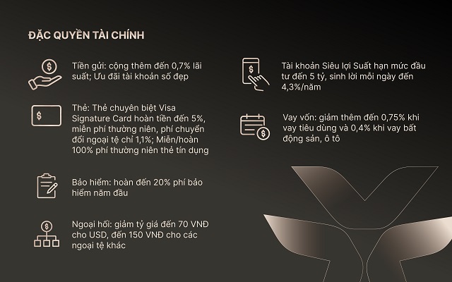 For those leveraging bank financing for investments, customers receive up to a 0.75% reduction on consumer loans and 0.4% on real estate and auto loans from VIB. For insurance and foreign exchange needs, customers enjoy up to 20% cashback on the first year’s life insurance premium and preferential exchange rates of up to 70 VND for USD and 150 VND for other currencies when transacting at VIB.
