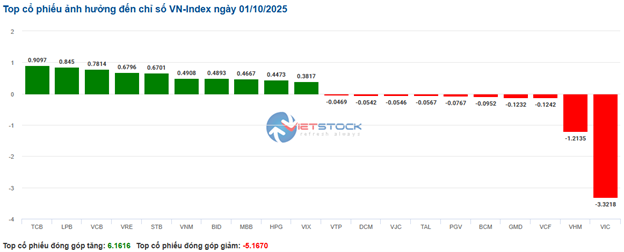 Top 10 stocks influencing the VN-Index on October 1, 2025