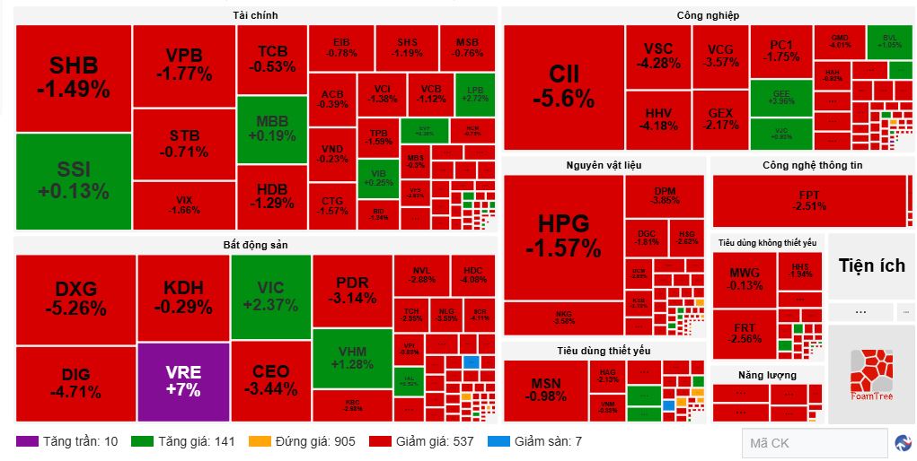 Most other sectors faced declines. In industrials, CII dropped 5%, with VSC, HHV, VCG, PC1, GMD, LCG, and CTD falling 2-3%. Raw materials were also in the red, led by HPG (-1.6%). The tech sector saw FPT decline 2.6%.
