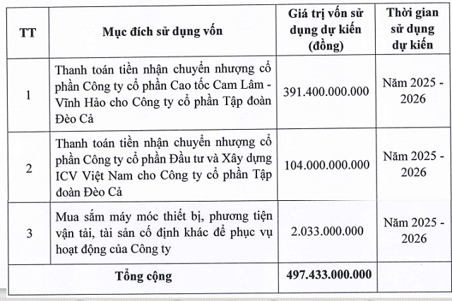 From this issuance, HHV expects to raise nearly VND 500 billion, with over VND 495 billion allocated to settle the payment for shares acquired from Deo Ca Group, including VND 391 billion for Cam Lam – Vinh Hao Expressway JSC and VND 104 billion for ICV Vietnam Construction and Investment JSC. This payment is scheduled for 2025-2026 and may be adjusted based on circumstances. This move will increase the company’s charter capital from VND 4.97 trillion to over VND 5.47 trillion.