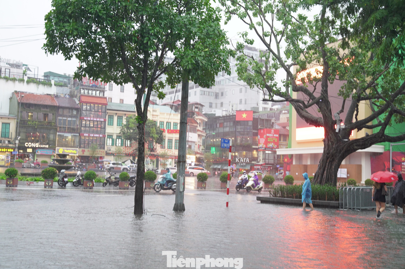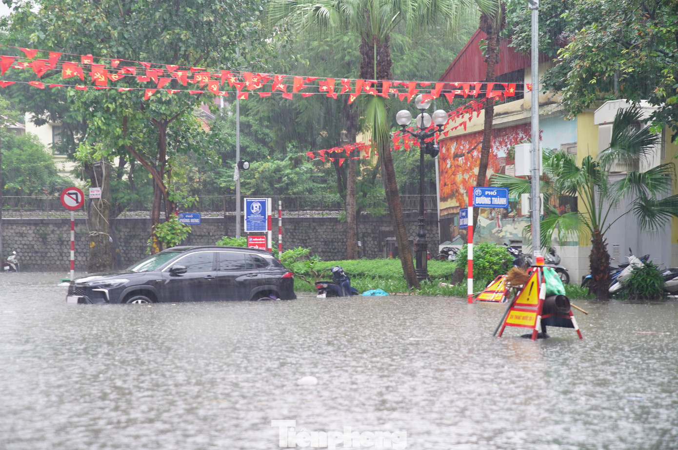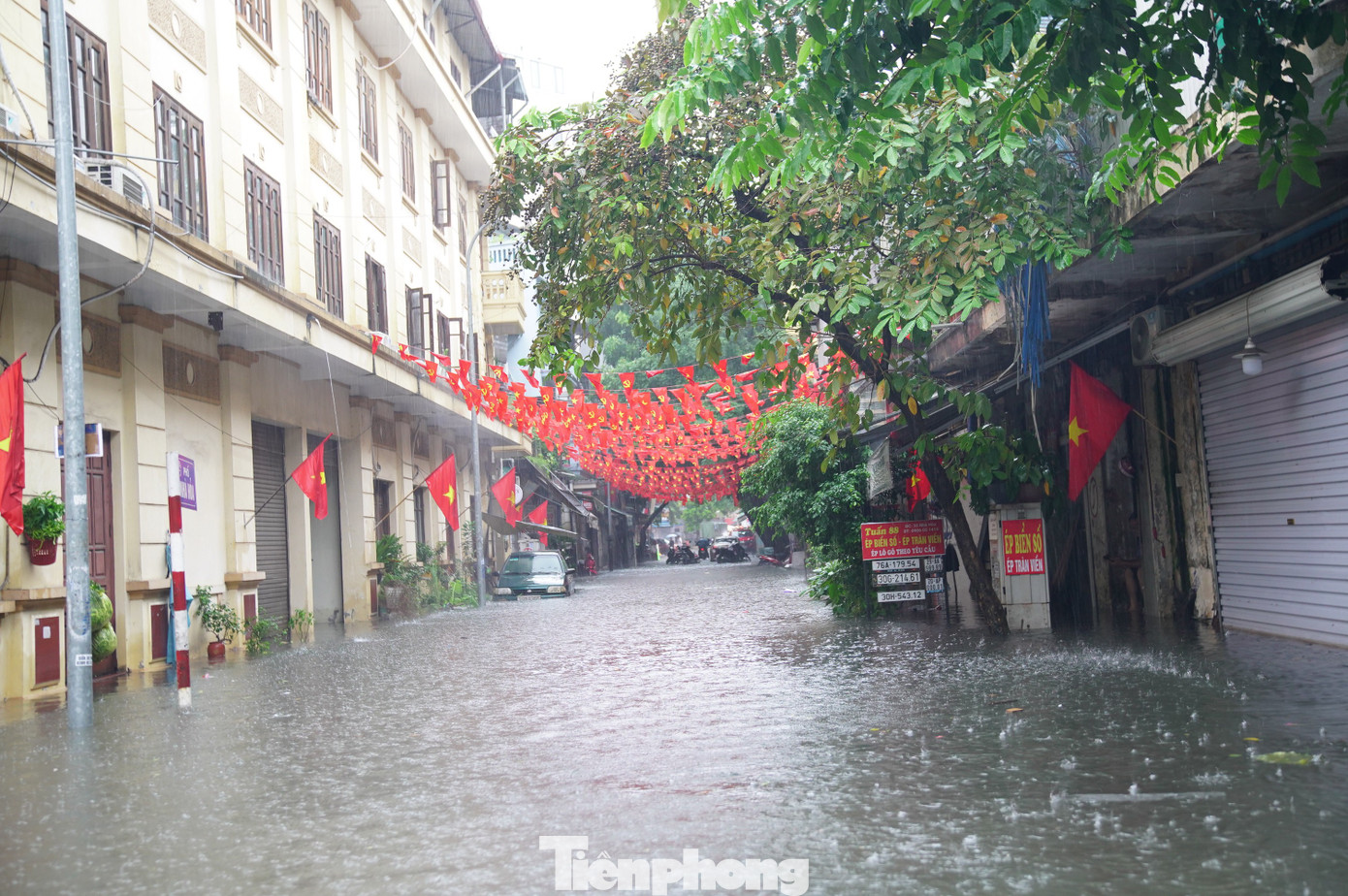 On the afternoon of September 30th, under the influence of Typhoon No. 10, Hanoi experienced heavy rainfall, leading to severe flooding on numerous streets. The Old Quarter was particularly hard-hit, with deep water inundating its roads. Additionally, the water from Hoan Kiem Lake overflowed its banks.