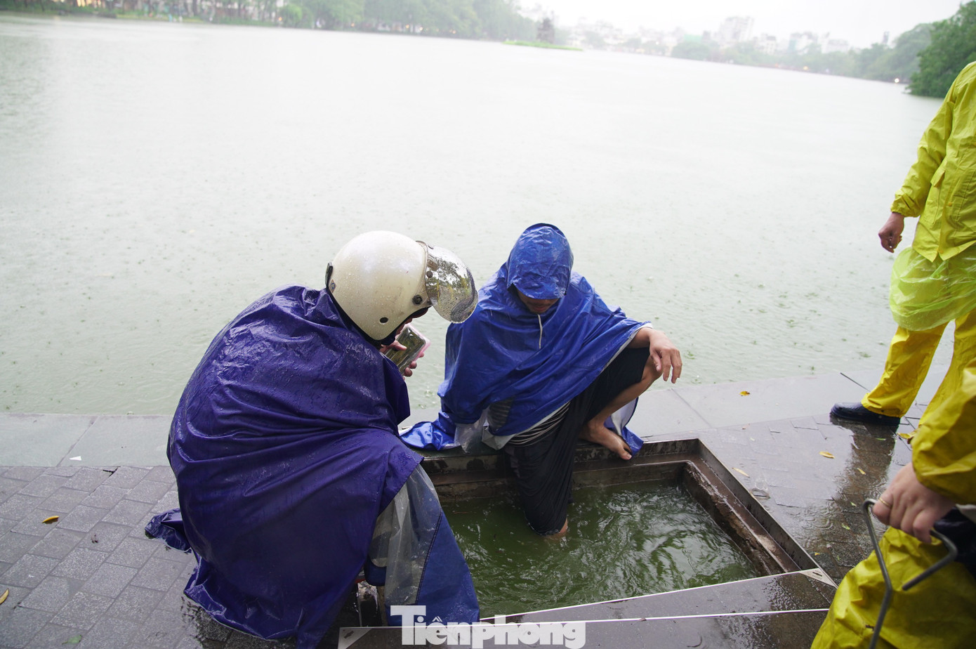 The overflowing lake water onto pathways left many locals and tourists surprised, as such an event is rare for Hoan Kiem Lake.