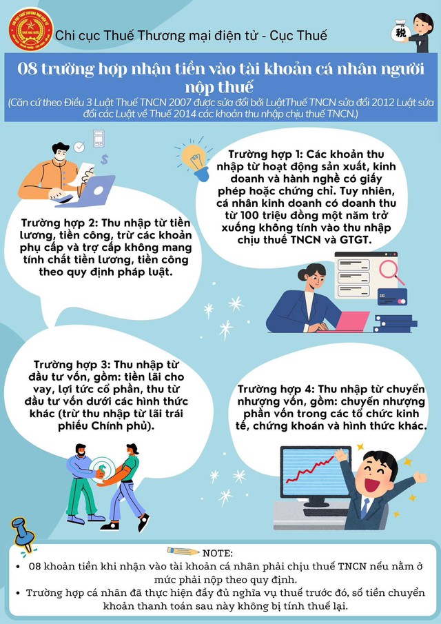The E-Commerce Tax Department emphasizes that the above 8 income categories, when deposited into personal accounts, are subject to personal income tax if they meet the taxable threshold.