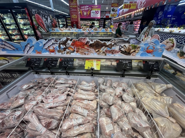 ![]() Frozen pork displayed in a supermarket. Photo: TÚ UYÊN |