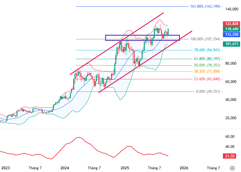 As mentioned in the August 2025 Crypto Report (Part 1), BTC’s weekly price continues to move within a bullish price channel and is retesting the 100% Fibonacci Projection level (equivalent to the $105,700–$111,500 USD range). This zone serves as a critical long-term support for the cryptocurrency.