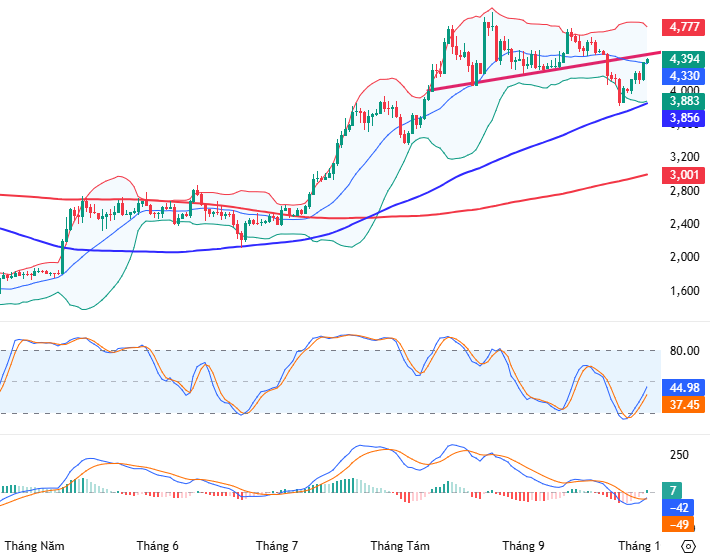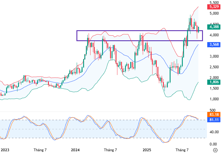 The VN-Index remains locked in a volatile tug-of-war around the Bollinger Bands’ Middle line. While the Stochastic Oscillator has flashed a buy signal, market churn persists. The August 2025 low (1,600-1,630 range) will serve as a critical support level for the index in the coming period.