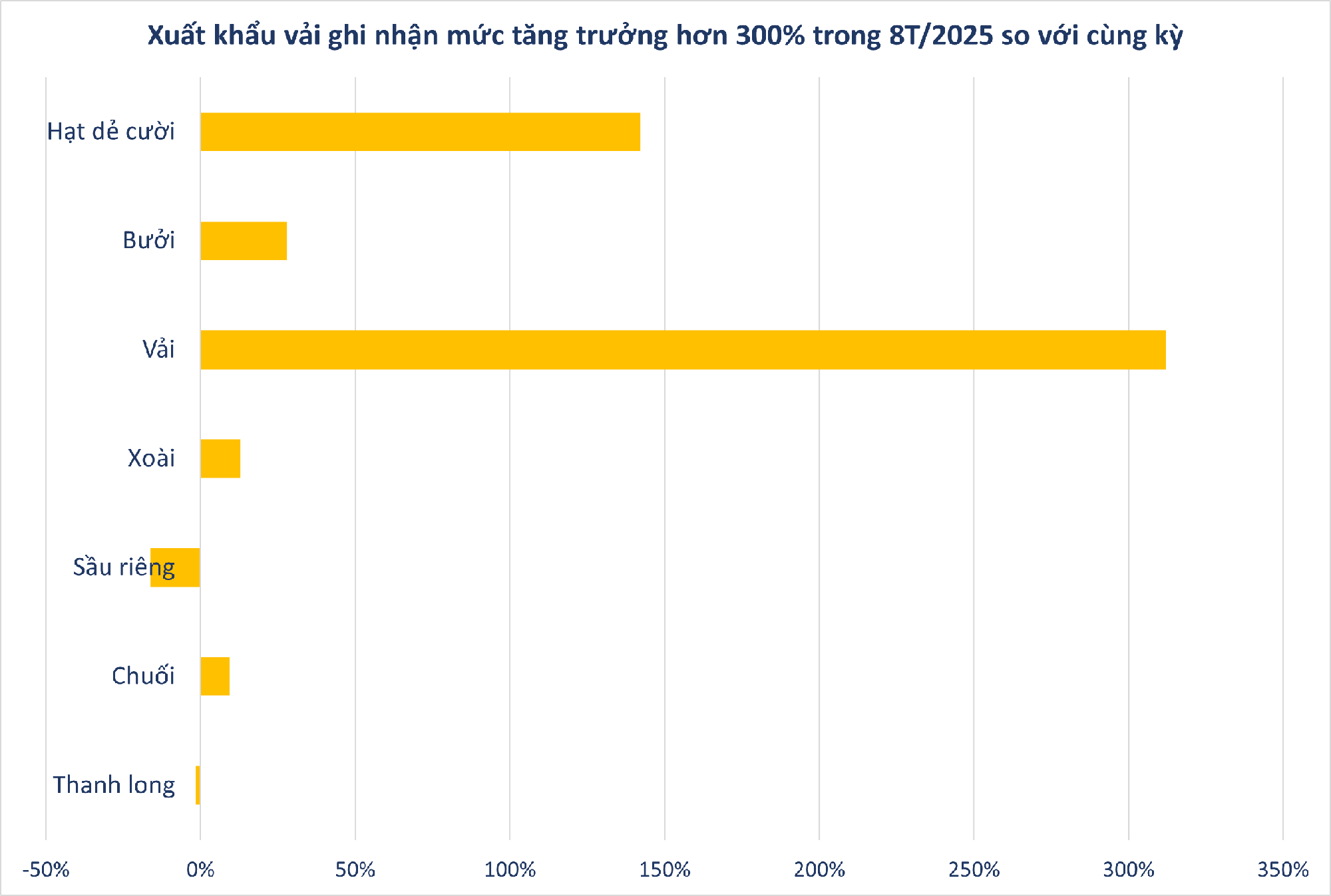 Meanwhile, China, a traditional market, is showing signs of stable recovery. Alongside durian regaining momentum, other fruit and vegetable exports are also experiencing strong growth. Notably, lychee exports reached nearly $3 million, a staggering 5,600% increase compared to August 2024. Year-to-date, this product has brought Vietnam over $72 million, up 300% year-on-year.