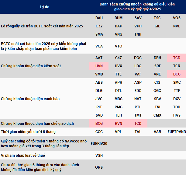 The list of stocks ineligible for margin trading in Q4/2025 on the Ho Chi Minh City Stock Exchange (HOSE) comprises 63 securities.