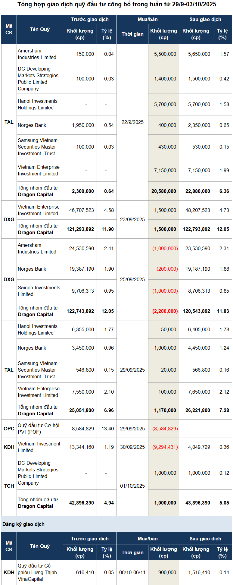 On September 29, Dragon Capital acquired nearly 1.2 million shares of TAL (Taseco Real Estate Investment JSC), increasing its ownership to over 7%, equivalent to 26 million shares. Based on the closing price, the transaction was valued at approximately VND 56 billion.