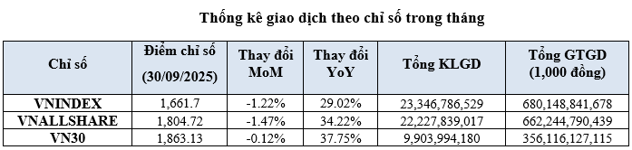 In September, only three sector indices showed growth: real estate (VNREAL) by 12%, healthcare (VNHEAL) by 5%, and raw materials (VNMAT) by 1%. Conversely, other sectors experienced declines, notably information technology (VNIT) by 8% and finance (VNFIN) by 6%.