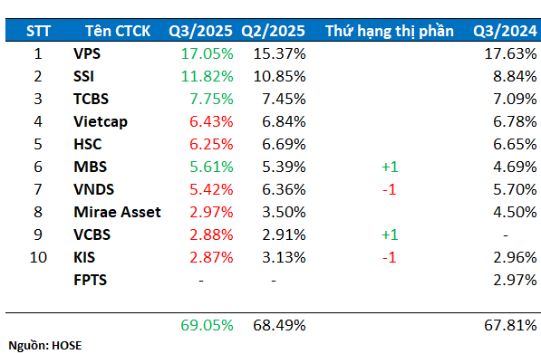Meanwhile, Vietcap Securities, Mirae Asset Vietnam Securities, Vietcombank Securities (VCBS), and KIS Vietnam Securities all experienced market share declines in Q3.