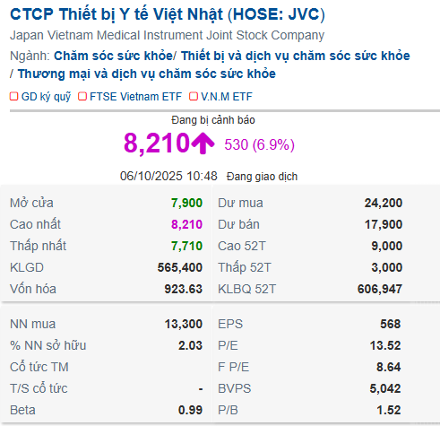 The resolution was published by HOSE on its website around 9 a.m. on October 6, causing JVC’s stock price to surge. By 10:50 a.m., JVC’s share price rose to 8,210 VND, ending a six-session losing streak.
