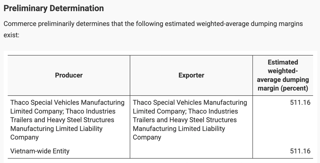 The DOC stated that THACO is the only Vietnamese enterprise subject to separate examination. After analysis, the agency calculated a dumping margin and imposed a preliminary duty rate of 511.16%—a record-high temporary tariff for cases involving heavy industrial products from Vietnam.