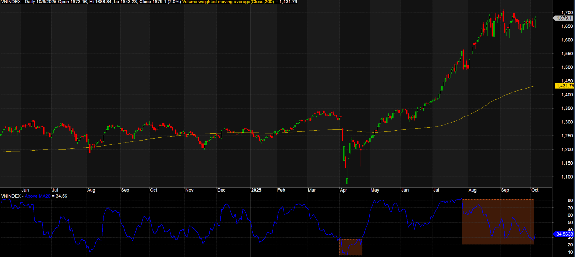 As of the close of trading on October 3rd, less than 25% of stocks on the HOSE showed short-term upward momentum (above the 20-day moving average, MA20), indicating a significant weakening in market breadth.