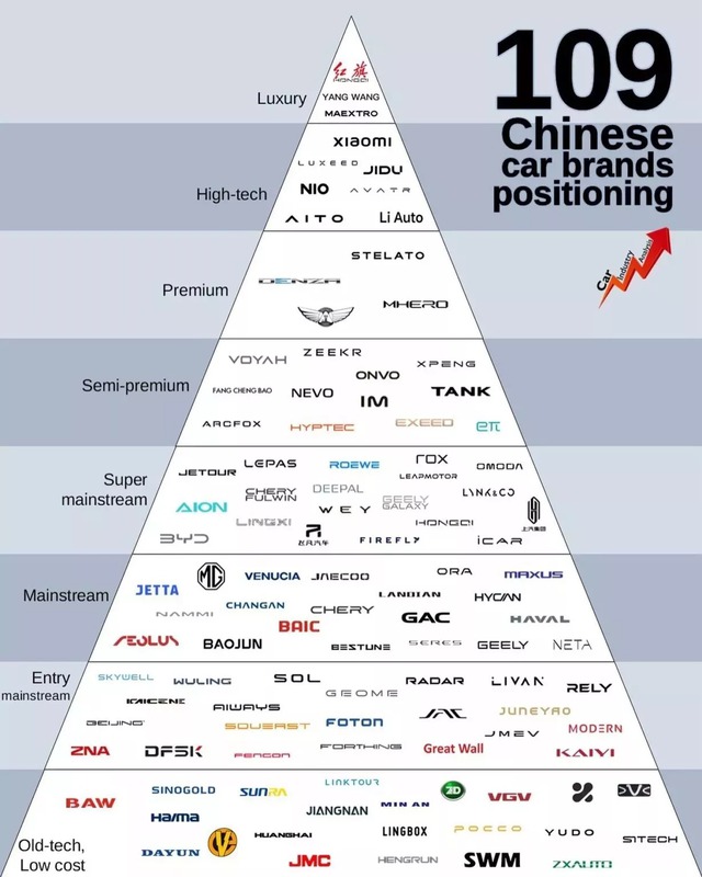 The complexity of China’s market is evident in its brand segmentation, forming a pyramid of 109 names, ranging from Ultra-Luxury (Hongqi, YangWang) to High-Tech (Nio, Xiaomi, Li Auto) and Affordable segments.