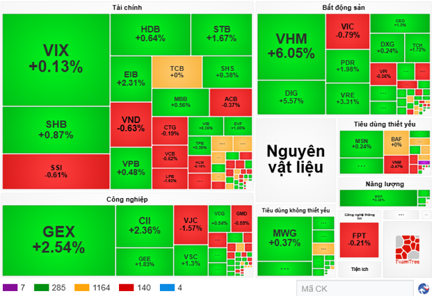 The entire market recorded 292 gaining stocks, including 7 ceiling stocks, gaining an advantage over 144 declining stocks, which included 4 floor stocks. The remaining 1,164 stocks remained unchanged. Green was present across many key sectors, particularly real estate, with VHM, DIG quickly increasing around 6%, and VRE rising over 3.3%.