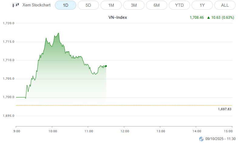 At the start of the 09/10 session, the Vietnamese stock market showed excitement, continuing from the previous afternoon session. As of 9:30 a.m., VN-Index increased by 7.17 points to 1,705, HNX-Index rose by 0.79 points to 274.13, and UPCoM-Index gained 0.69 points to 111.12.