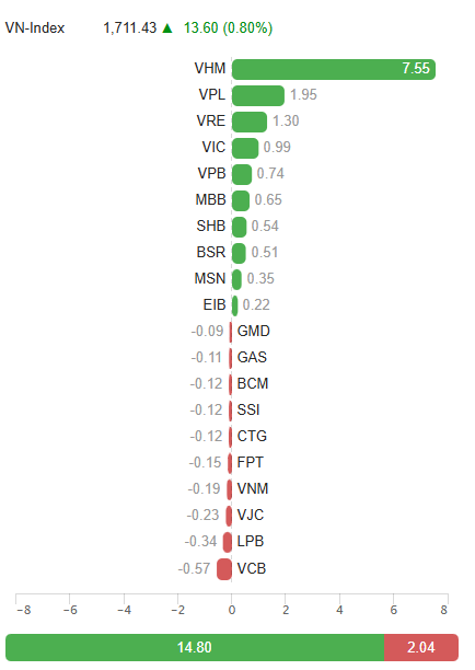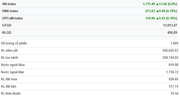 As of 10:30 a.m., VN-Index increased by 13.66 points to 1,711.49, HNX-Index rose by 0.49 points to 273.83, and UPCoM-Index gained 0.43 points to 110.86.