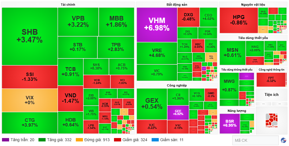 During the afternoon session, the market showed significantly more positive developments compared to the morning. Specifically, green stocks outnumbered red ones, with 342 green stocks and 20 purple ceiling stocks, slightly more than the 320 red stocks and 12 floor-dropping stocks.