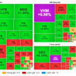 – The VN30-Index gained nearly 18 points, closing at 1,940.89 points. The basket’s breadth favored buyers, with 18 stocks rising, 11 falling, and 1 unchanged. Among these, VHM stood out with a vibrant purple hue. Following closely were VRE, CTG, SHB, and VPB, all surging over 3%. Conversely, LPB, SSI, VCB, and BCM faced selling pressure, declining more than 1%.