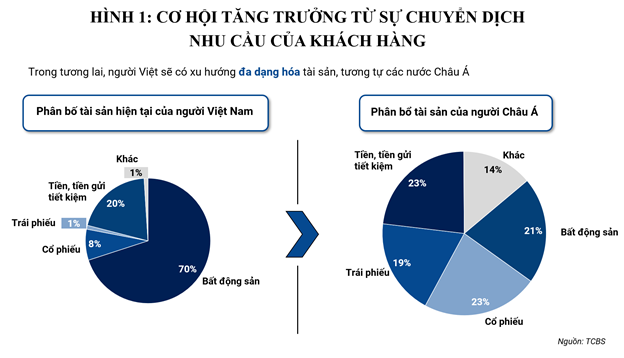 The illustration highlights the significant difference in liquidity between individual investor portfolios in Vietnam and other Asian countries. Vietnamese investors hold a large proportion of illiquid assets, primarily real estate, accounting for 70% of their portfolios, compared to 21% in Asia. Meanwhile, financial assets are underrepresented, with stocks at 8% versus 23% and bonds at 1% versus 19%. Additionally, liquidity-supporting and diversifying assets like deposits and alternative investments are underutilized.
