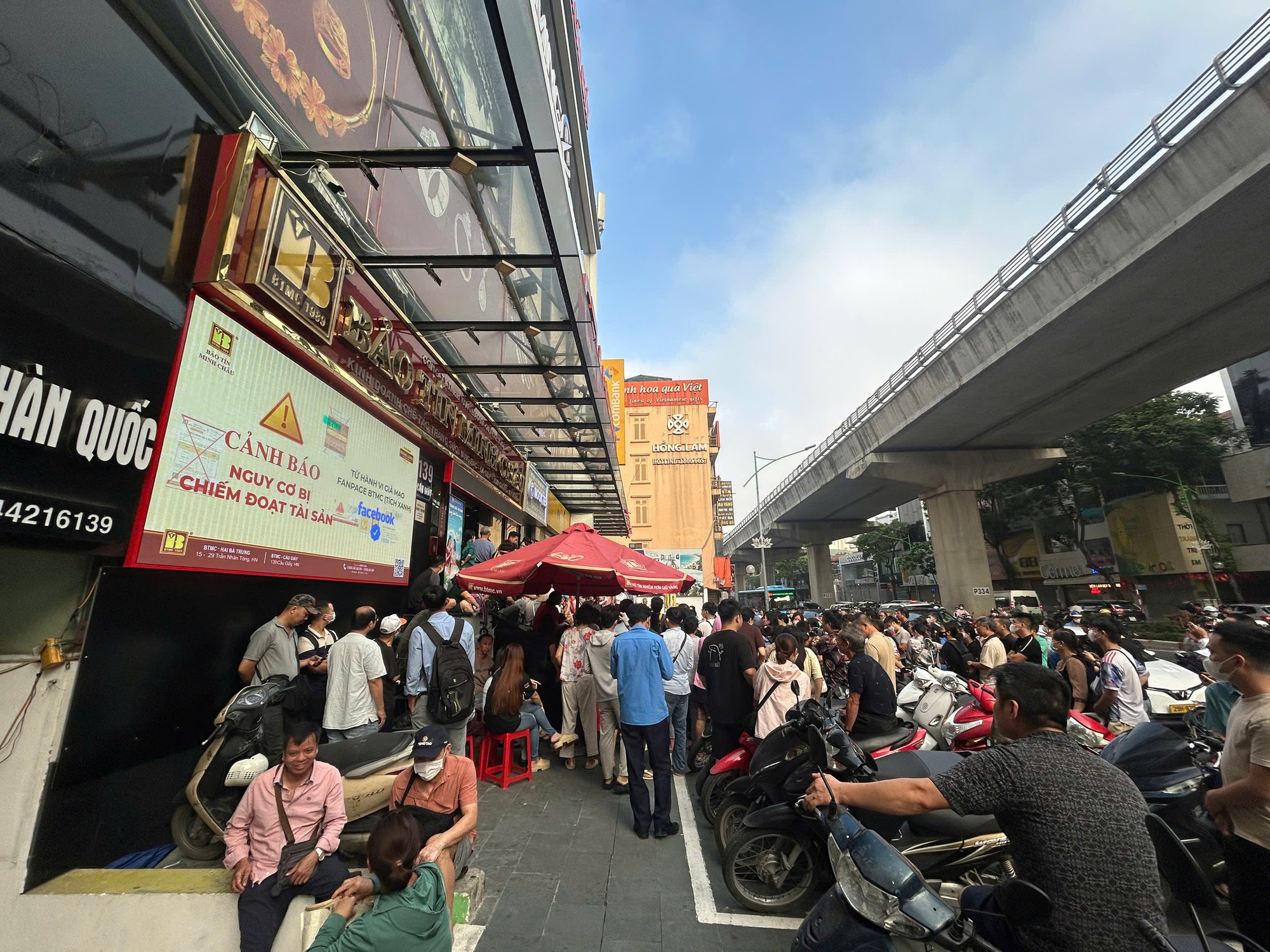 Amid soaring gold prices, reporters from *Nguoi Lao Dong* newspaper observed hundreds of people queuing at Bao Tin Minh Chau’s gold store on Cau Giay Street (Hanoi) from early morning to buy gold and conduct related transactions.