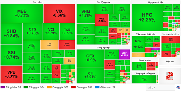 In addition to these two sectors, many large-cap financial stocks also showed positive movements. TCB, SSI, HDB, and SHB contributed to supporting the index.