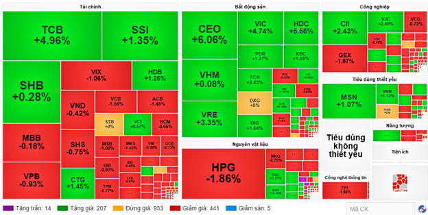 Numerous VN30 stocks fell sharply, including HPG, FPT, VPB, ACB, HDB… Only VIC, VHM, VRE, TCB, and MSN maintained a green status.