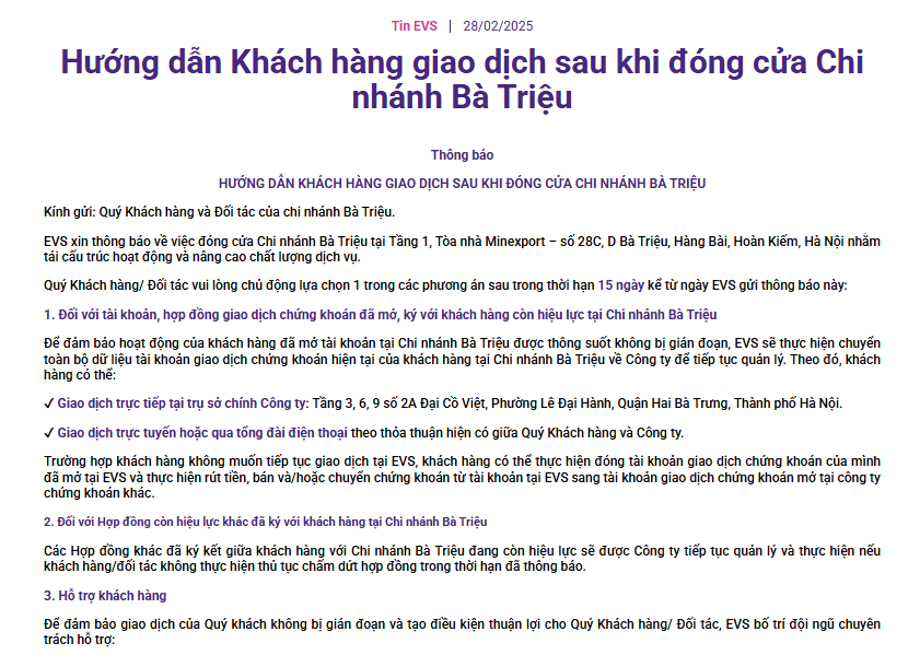In reality, the closure of the Ba Trieu branch was approved by the EVS Board of Directors in February 2025. At that time, the company also posted a notice on its website guiding customers on transactions after the branch closure.