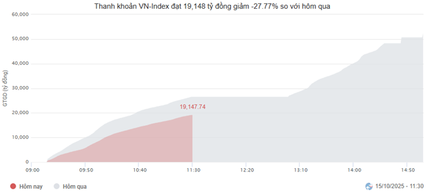Investor sentiment remained cautious, with the HOSE trading volume reaching only over 613 million units in the morning, equivalent to a value of more than 19 trillion VND, a 27.77% decrease from the previous session. The HNX recorded a volume of over 41 million units, equivalent to 1 trillion VND.
