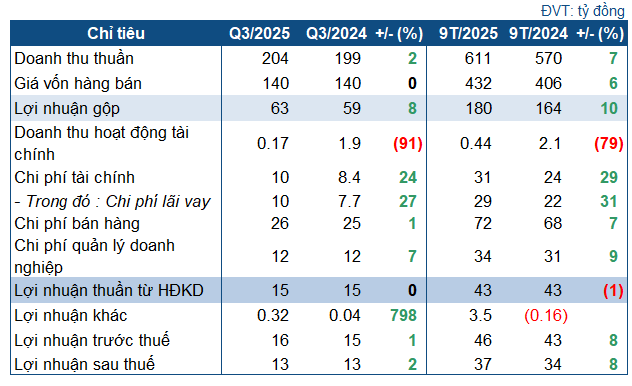 In Q3/2025, AGP recorded net revenue of nearly VND 204 billion, a slight increase of 2.4% year-on-year. Cost of goods sold remained relatively stable, driving an 8% rise in gross profit to over VND 63 billion.