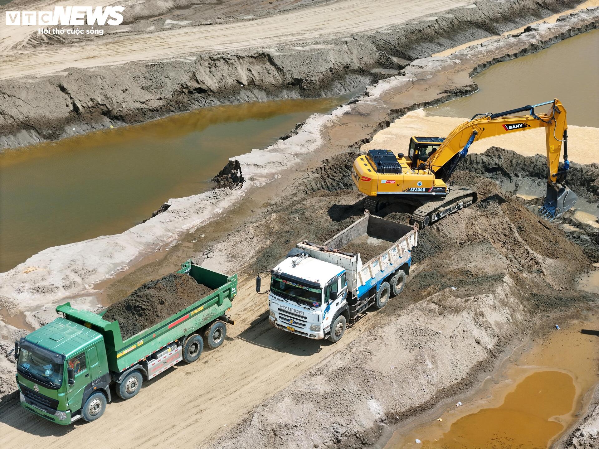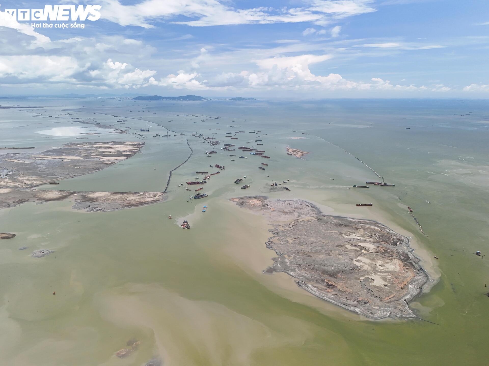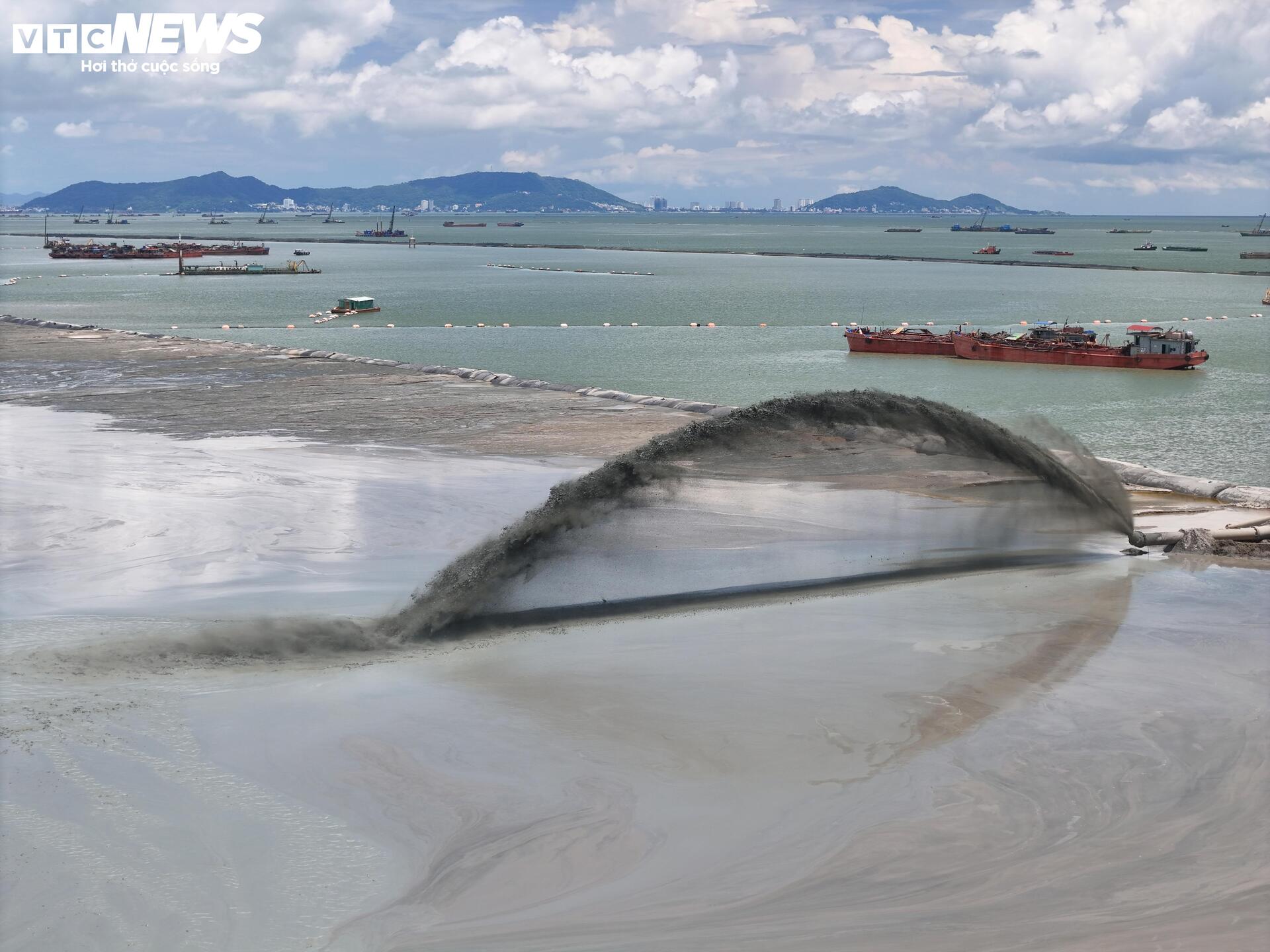 At the boundary between the mainland and the reclaimed area, the embankment system, utility roads, material storage yards, and the construction management area are gradually taking shape. The extensive land reclamation stretches for kilometers along the coastline, showcasing the project’s massive scale and initial phase workload.