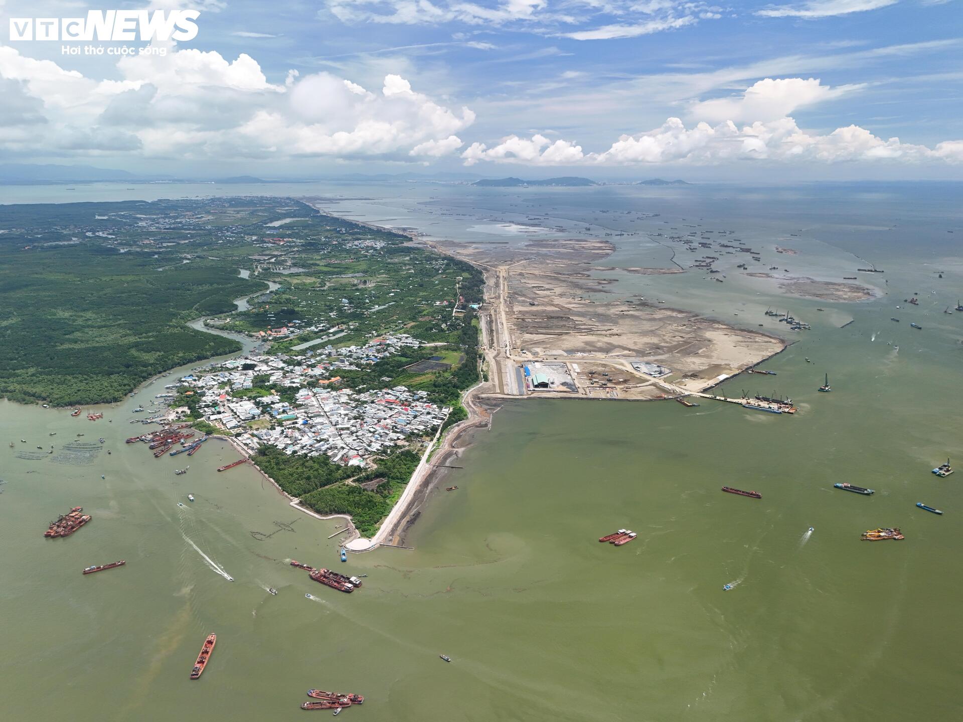 Aerial views of Mui Dong Tranh reveal the vibrant construction site of the Can Gio coastal urban area – Vinhomes Green Paradise. New land strips extend towards the sea, interspersed with hundreds of hectares of land reclamation, bustling with dredgers, barges, and cranes in operation.