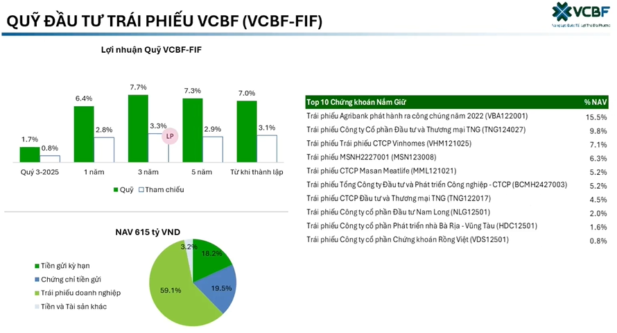 In the bond segment, the VCBF Bond Fund (VCBF-FIF) achieved 1.7% in Q3 and a 12-month average of 6.4%. As of September, VCBF-FIF’s total assets were 615 billion VND, with bond holdings increasing from 54% at the end of Q2 to 59% at the end of Q3.