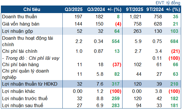 For the first nine months, NFC reported a net revenue of nearly VND 1,021 billion and an after-tax profit of VND 94 billion, up 35% and 181% year-on-year, respectively. Compared to the 2025 Annual General Meeting’s plan, the company has nearly completed its revenue target at 97% and exceeded its pre-tax profit goal by 84%.