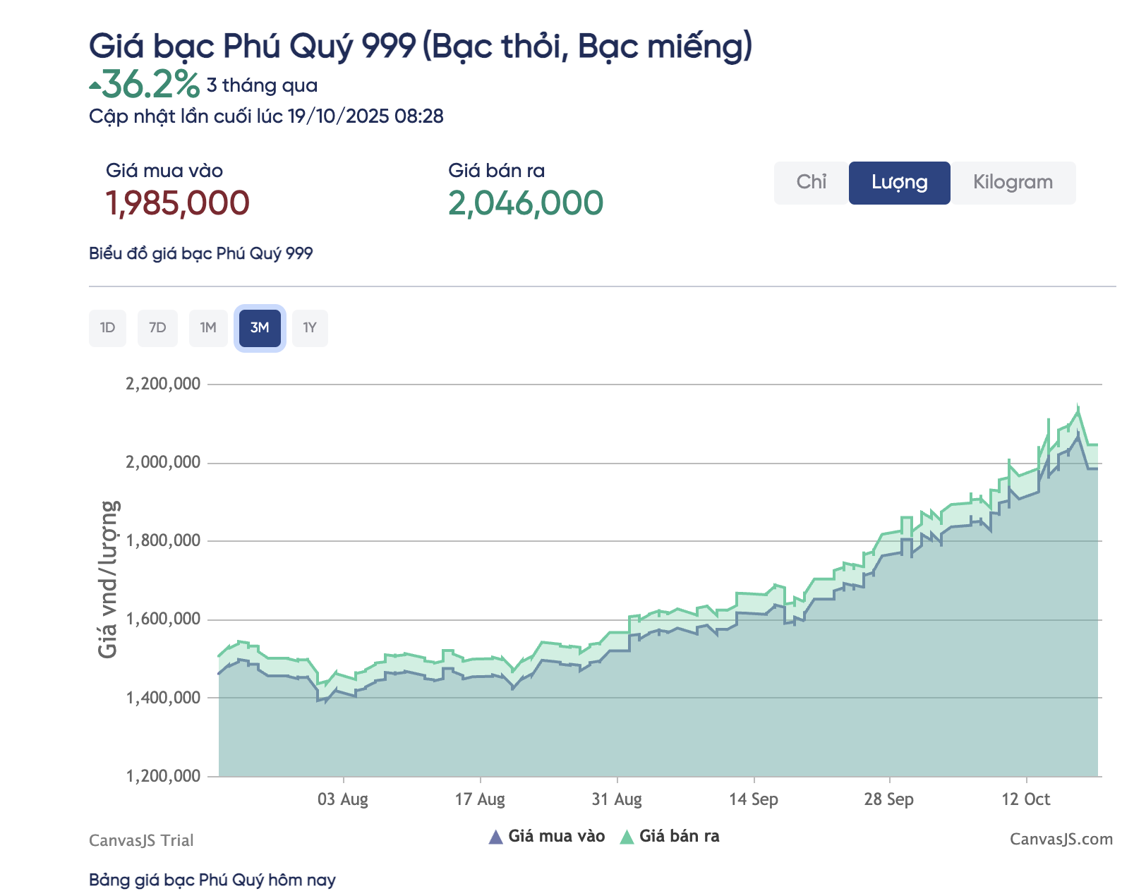 Over the weekend of October 19th, domestic silver prices were quoted by Vietnamese enterprises at approximately VND 1,985 million per tael for buying and VND 2,046 million per tael for selling, marking a 2.6% increase compared to the previous weekend. Over the past month, silver prices have surged by 22%, and over the last three months, they have risen by a total of 36%.