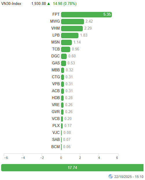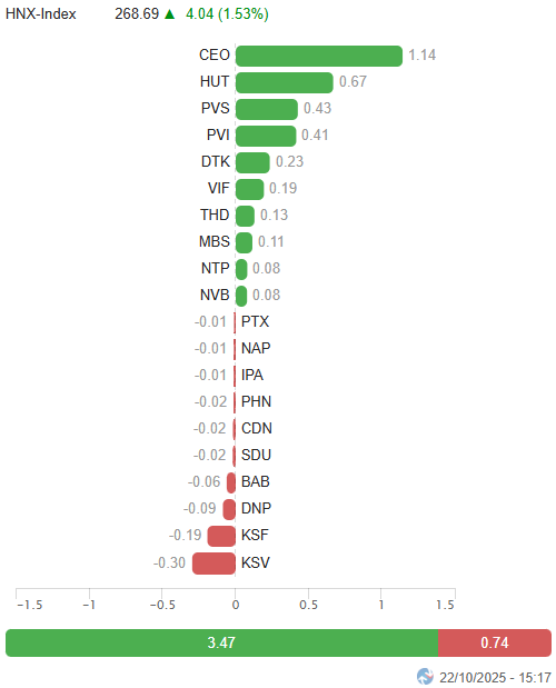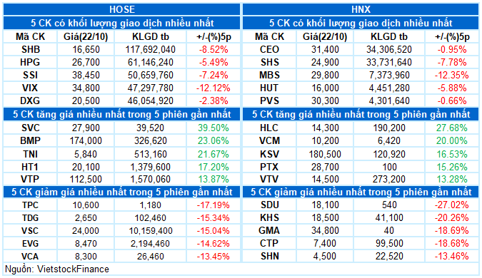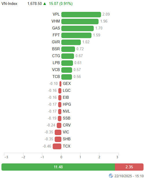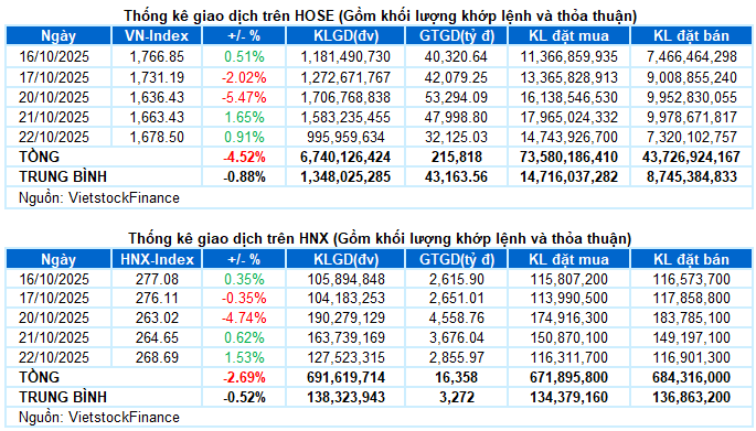 – Key indices continued their recovery trend during the October 22 trading session. Specifically, the VN-Index rose by 0.91%, reaching 1,678.5 points, while the HNX-Index also increased by 1.53%, closing at 268.69 points.