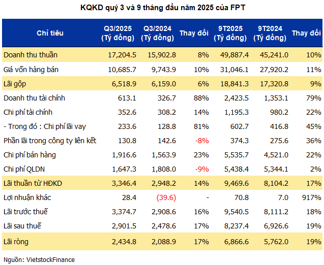 For the first nine months, FPT recorded VND 49,887 billion in revenue and VND 6,867 billion in net profit, up 10% and 19% respectively. The company achieved 66% of its annual revenue target and 71% of its profit goal, both record highs for a 9-month period.