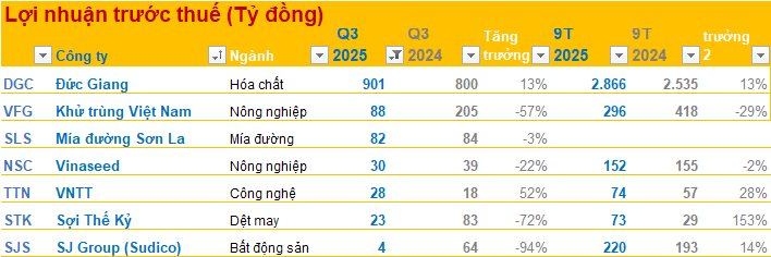Duc Giang (DGC) reported a 13% increase in Q3 pre-tax profit to VND 901 billion, with a 13% rise in the first nine months to VND 2,866 billion.