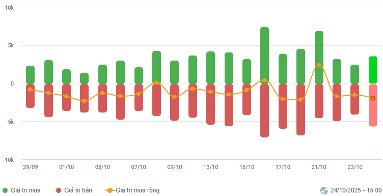 Trading Activity: Key indices showed mixed movements during the October 24 session. The VN-Index closed the week at 1,683.18 points, down 0.23% from the previous session. Meanwhile, the HNX-Index edged up 0.19% to 267.28 points. For the full week, the VN-Index lost 48.01 points (-2.77%), while the HNX-Index declined by 8.83 points (-3.2%) compared to the prior week.
