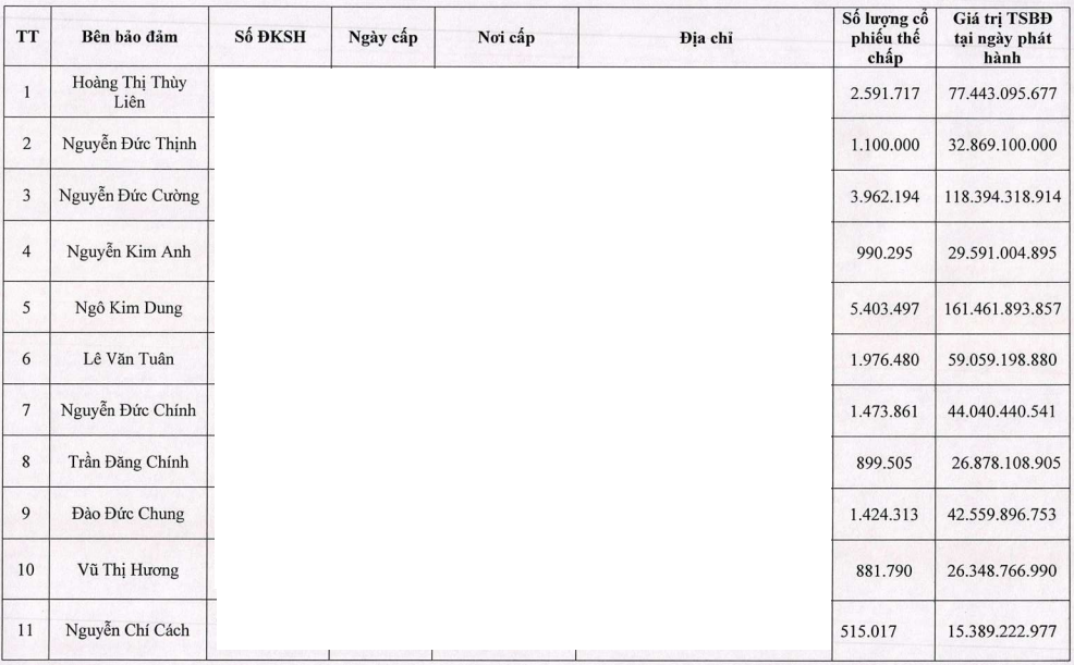 The collateral for this bond issuance includes over 21.2 million TDP shares held by 11 individuals, among them key leaders such as: Chairman Nguyễn Đức Cường (nearly 4 million shares), Board Member Nguyễn Kim Anh (990,295 shares), and Board Member cum Deputy General Director Ngô Kim Dung (over 5.4 million shares).