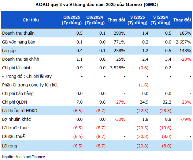 Garmex incurred a net loss of 6.5 billion VND in Q3/2025, although this was a reduction from the nearly 9 billion VND loss in the same period last year. This marks the largest loss of the year. Accumulated losses for the first nine months reached nearly 21 billion VND, bringing the total accumulated losses by the end of September 2025 to 125 billion VND. Shareholders’ equity now stands at just over 345 billion VND.