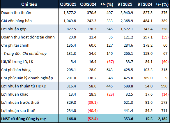 NLG’s Q3 and 9-month business results in 2025. Unit: Billion VND
