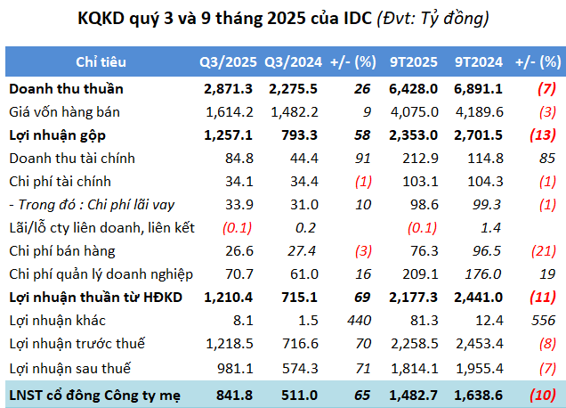 The primary reason is the 31% drop in land and IZ infrastructure sub-leasing revenue to over VND 1,900 billion, while real estate sales fell by more than 30% to VND 340 billion. In contrast, the electricity business contributed the most at 43% of revenue, reaching VND 2,786 billion, an 18% increase year-on-year.